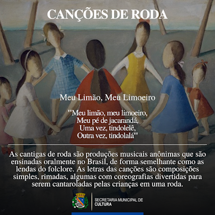 📣 Confira, nas imagens acima, parte das músicas do Folclore Brasileiro que, através de composições simples, transmitia saberes populares e foi base para inúmeras brincadeiras durante a infância de boa parte da população brasileira.